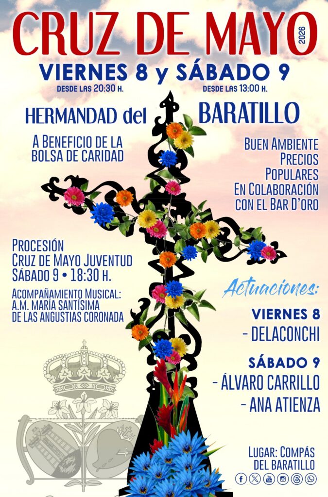 La Hermandad del Baratillo celebrará nuevamente la tradicional Cruz de Mayo, organizada por la Diputación de Caridad, los próximos días 8 y 9 de mayo en el Compás