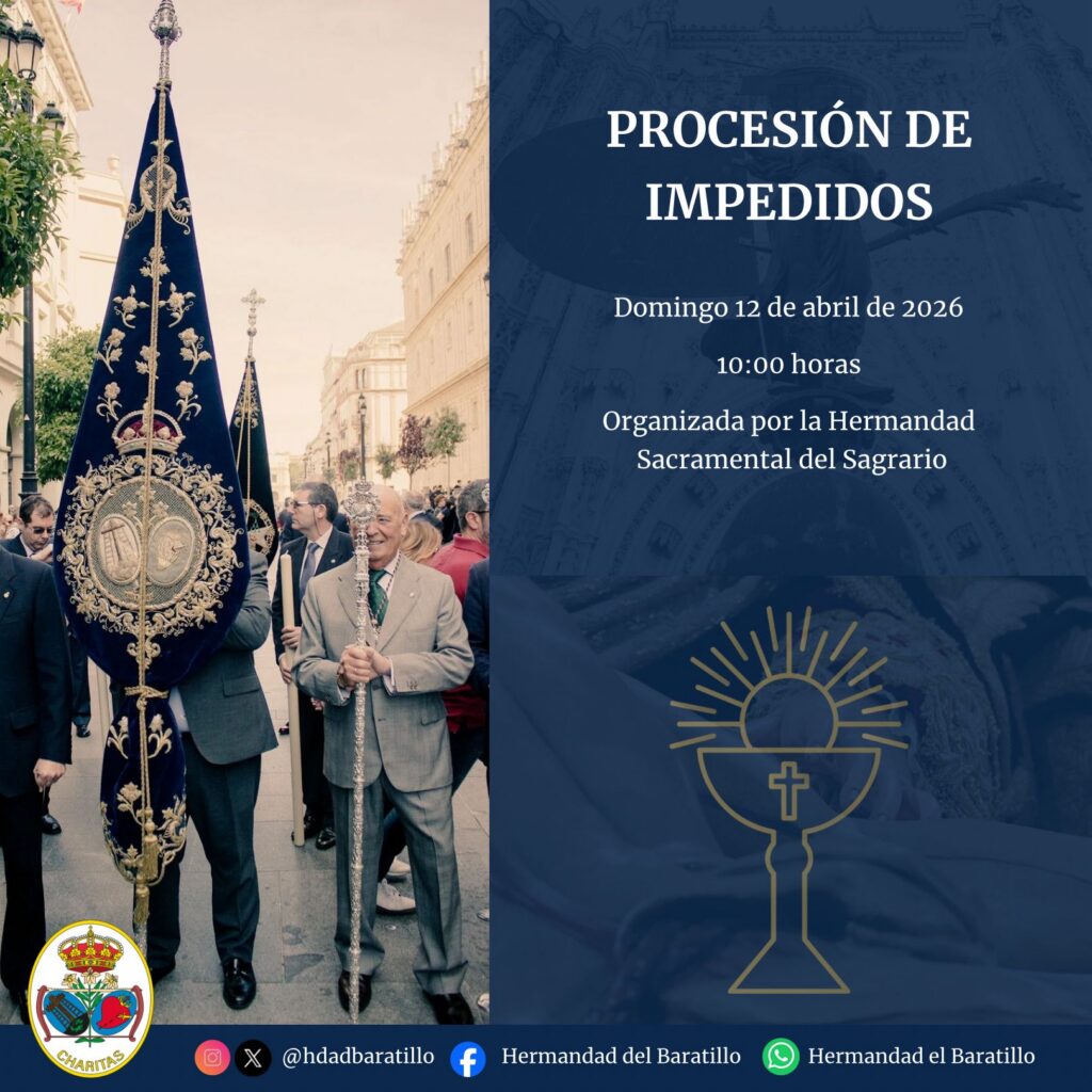 El próximo domingo 12 de abril, se celebrará, a partir de las 10:00 horas en la parroquia del Sagrario de la Catedral de Sevilla, la Procesión de Impedidos organizada por la Archicofradía Sacramental del Sagrario, en la que participaremos con estandarte, varas y cirios junto con las demás Hermandades y Cofradías de la feligresía. Aquellos […]