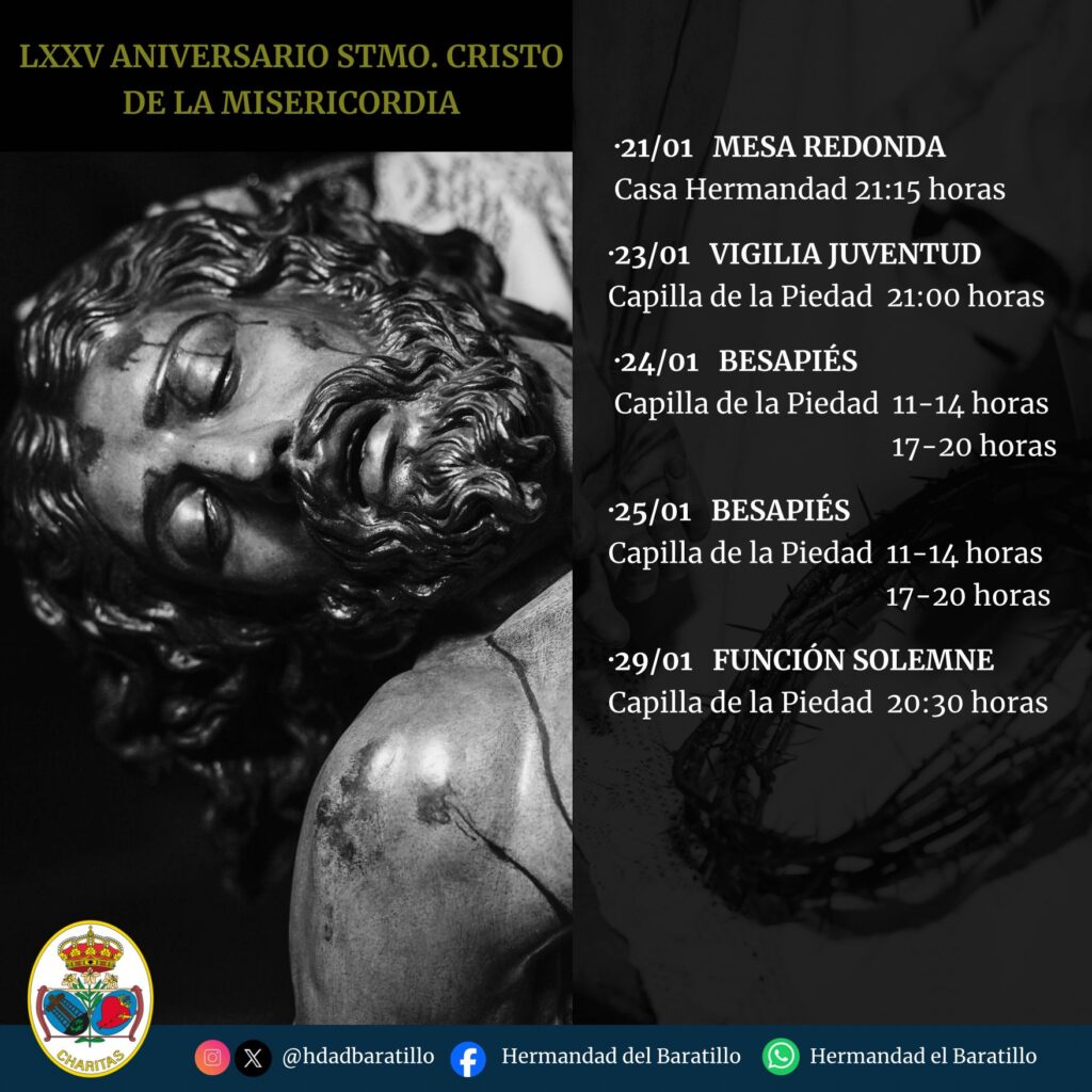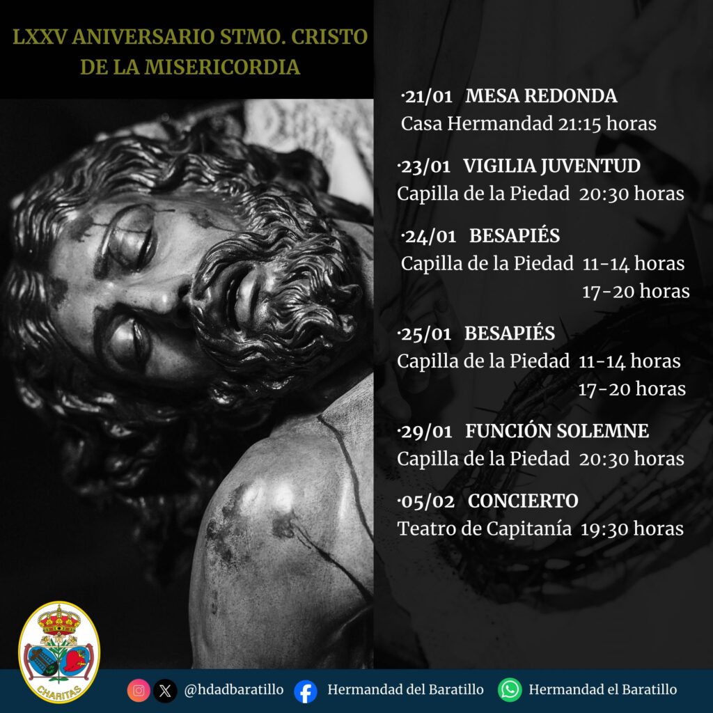 Con motivo del 75 aniversario de la hechura del Stmo. Cristo de la Misericordia, obra cumbre de Luis Ortega Bru bendecida el 29 de enero de 1951, la Hermandad del Baratillo ha organizado un programa de actos y cultos para conmemorar con la dignidad que merece tan importante efeméride: