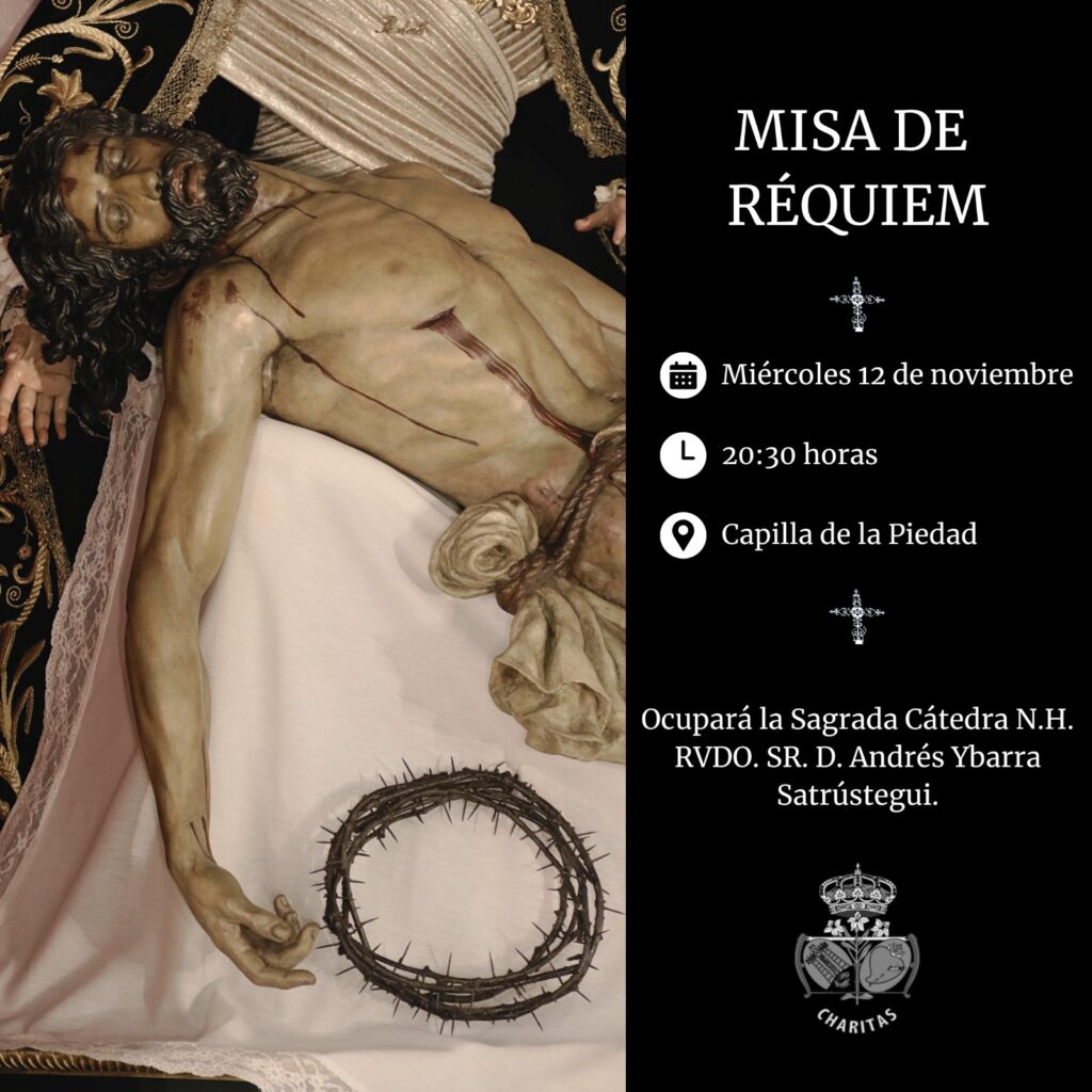 Tal y como establecen nuestras Reglas, el próximo miércoles 12 de noviembre, coincidiendo con la Misa de Hermandad, celebraremos a las 20:30 horas, la Misa de Réquiem en sufragio de las almas de nuestros hermanos difuntos, y muy especialmente por los fallecidos en el último año.