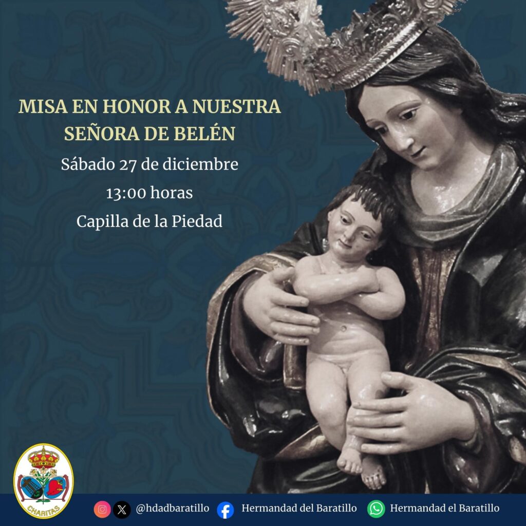 El próximo sábado 27 de diciembre a las 13:00 horas, celebraremos en la Capilla de la Piedad la tradicional Misa en honor a Nuestra Señora de Belén, cuya imagen preside el ático del Retablo Mayor.